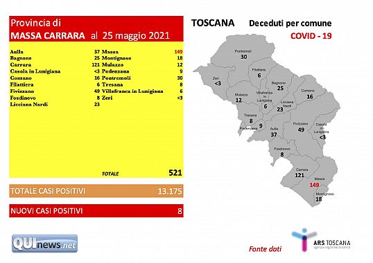 A livello provinciale il contagio ha colpito 8 persone in più nelle ultime ventiquattro ore, mentre la triste contabilità dei deceduti totali da inizio pandemia in provincia rimane stabile a 521 morti. Il bollettino della Regione conta un totale, ad oggi, di 13.175 persone positive a coronavirus in provincia di Massa Carrara.