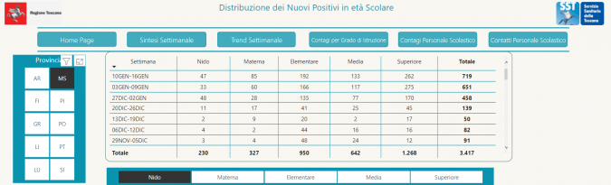 Per quanto riguarda il personale scolastico, dal 10 al 16 Gennaio è stato registrato un nuovo caso di contagio, relativo a un docente a Massa i cui contatti tracciati sono 21.