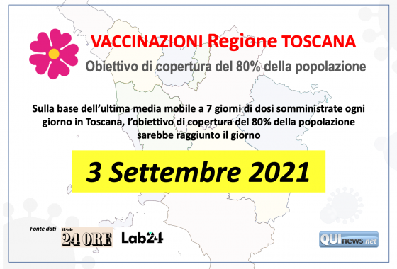 . — Nella prima tabella la percentuale dei tamponi positivi sui casi sospetti, nella seconda le vaccinazioni nella Regione Toscana e nella terza la data prevista di somministrazione al 70% dei toscani. Segue poi il primo grafico con i nuovi contagi, i pazienti positivi ricoverati in ospedale e quelli in terapia intensiva. Infine nel secondo grafico il totale dei casi positivi, dei positivi attuali, dei deceduti e dei guariti.