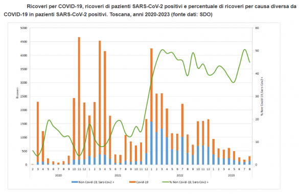 La prima distinzione operata dagli esperti è il bilanciamento fra pazienti giunti in ospedale per Covid e con Covid: "Nei primi 8 mesi del 2023 i ricoveri di pazienti positivi ai test per il Sars-CoV-2 in Toscana sono stati complessivamente 3.946, con 1.624 ricoveri per motivi diversi dalla Covid-19 (41,1%)".