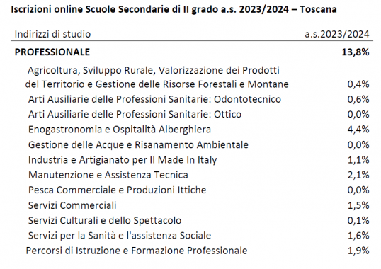 In Toscana dopo licei e istituti tecnici il numero complessivo di nuovi iscritti si completa col 13,8% che ha opzionato la formazione professionale.