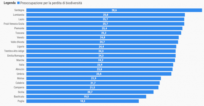 Il territorio in cui ci sono più persone preoccupate per la perdita di specie animali e vegetali è la Sardegna (28,6%) a cui seguono Lombardia (25,8%), Lazio e Friuli-Venezia Giulia (25,7%), Piemonte (25,4%) e quindi la Toscana